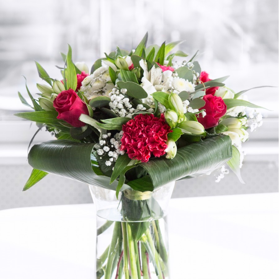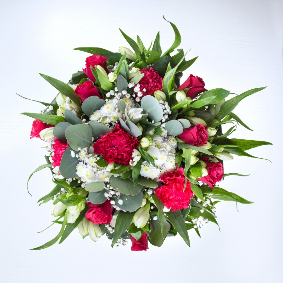 Delight in the stunning beauty of this unique bouquet, designed to inspire and enchant. Featuring vibrant red roses intertwined with sweet white chrysanthemums and delicate gypsophila, complemented by lively carnations and elegant white alstroemeria. The lush aspidistra leaves add a sophisticated touch to the overall arrangement.