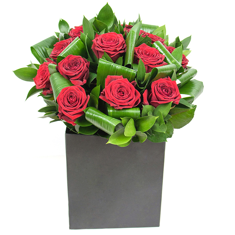 Experience the elegance and charm of our stunning red rose bouquet, expertly combined with lush aspidistra leaves and vibrant ruscus. This unique arrangement is designed to add a touch of sophistication to any space.